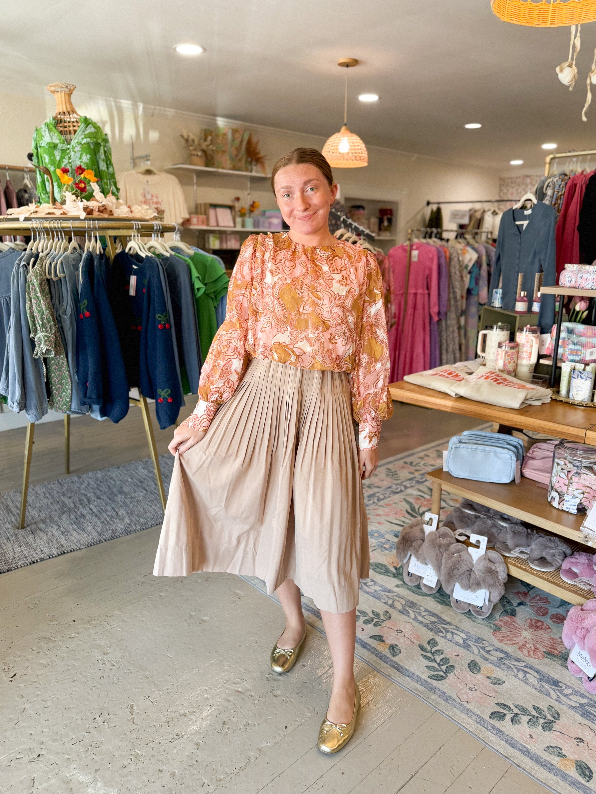 A printed woven jacquard top featuring round neckline, long blouson sleeve with cuff and back neck button closure Details: Self : 100% Polyester Lining : 100% Polyester Size & Fit