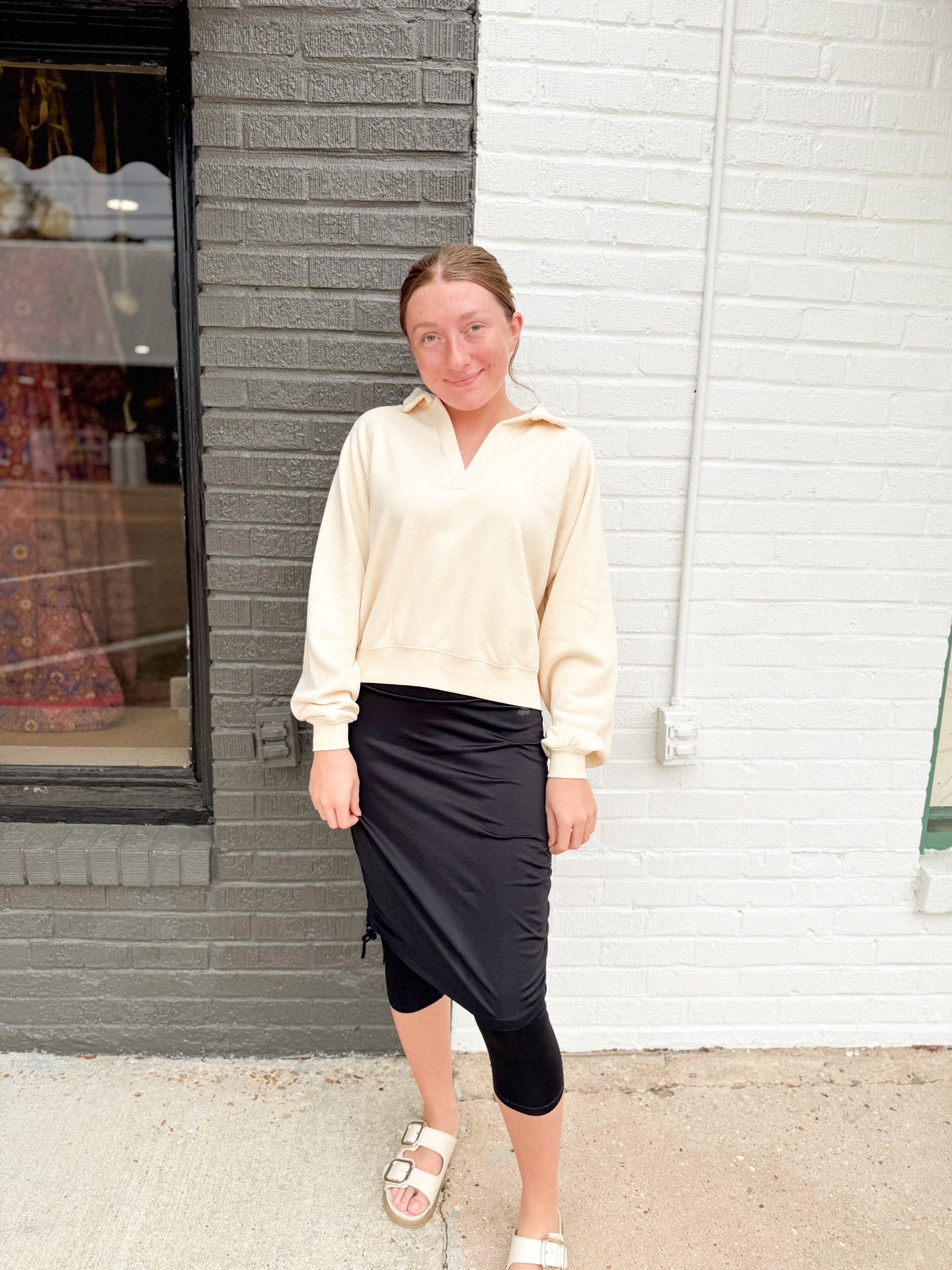 This casual collared sweatshirt features a relaxed fit and comfortable fabric. The design includes a v-neck collar, long sleeves, and ribbed hemline and cuffs. Perfect for a cozy, laid-back look, it can be paired with jeans or joggers for effortless style. 51% cotton 49% polyester