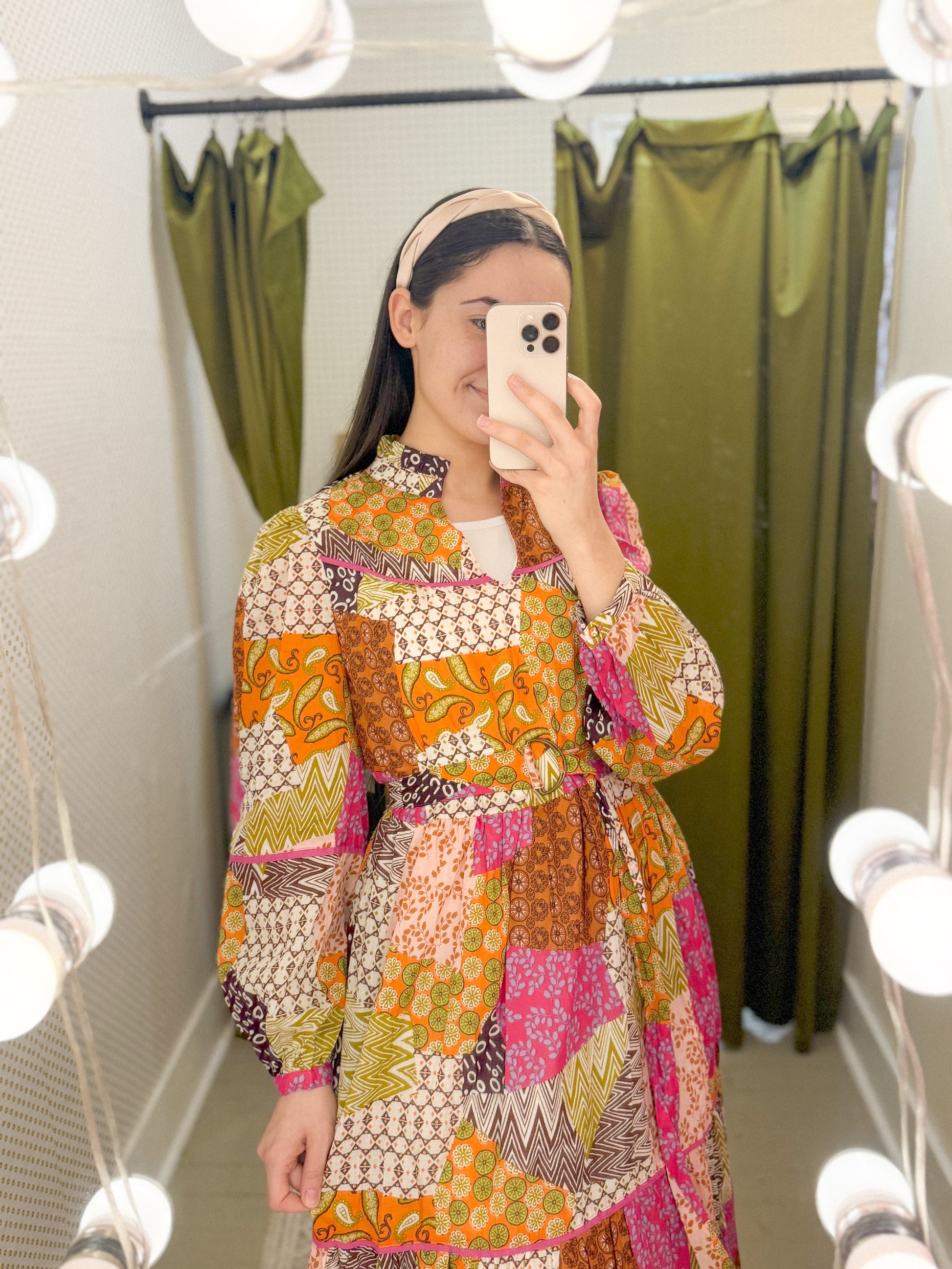 PATCHWORK PRINT COTTON VOILE PIPING DETAIL BELTED MIDI DRESS S:100%COTTON / L:100%COTTON