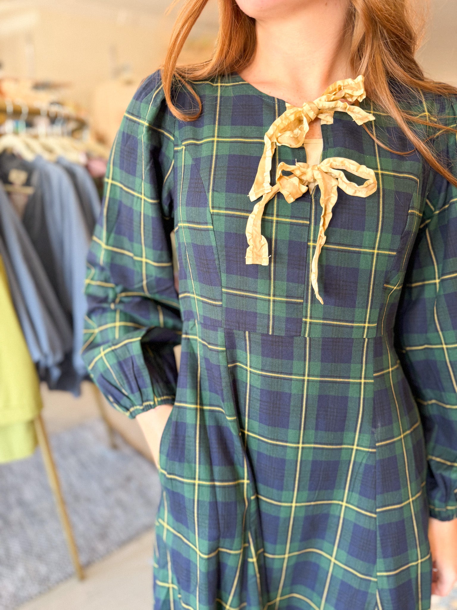 PLAID BOW FRONT MAXI DRESS FEATURES: -LONG SLEEVES WITH ELASTIC BAND - COTTON TARTAN PLAID FABRICATION - SELF TIE FRONT BOWS - BACK ELASTIC WAISTBAND - SIDE POCKETS - HIDDEN SIDE ZIPPER - FULL LINING