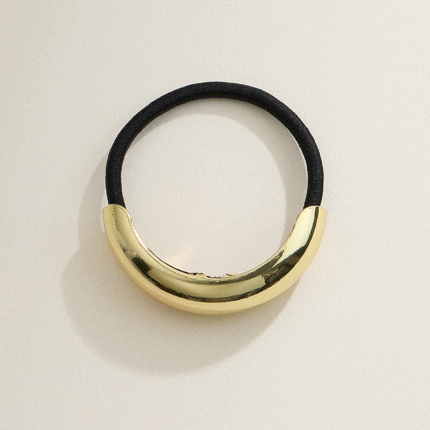 Sleek and sculptural, the Sculpted Crescent Hair Tie features a bold half-moon shape in either polished gold or silver. This minimalist piece combines an elegant metal curve with a soft black elastic for secure, all-day wear. Sold individually, it's the perfect finishing touch for modern, elevated hairstyles.
